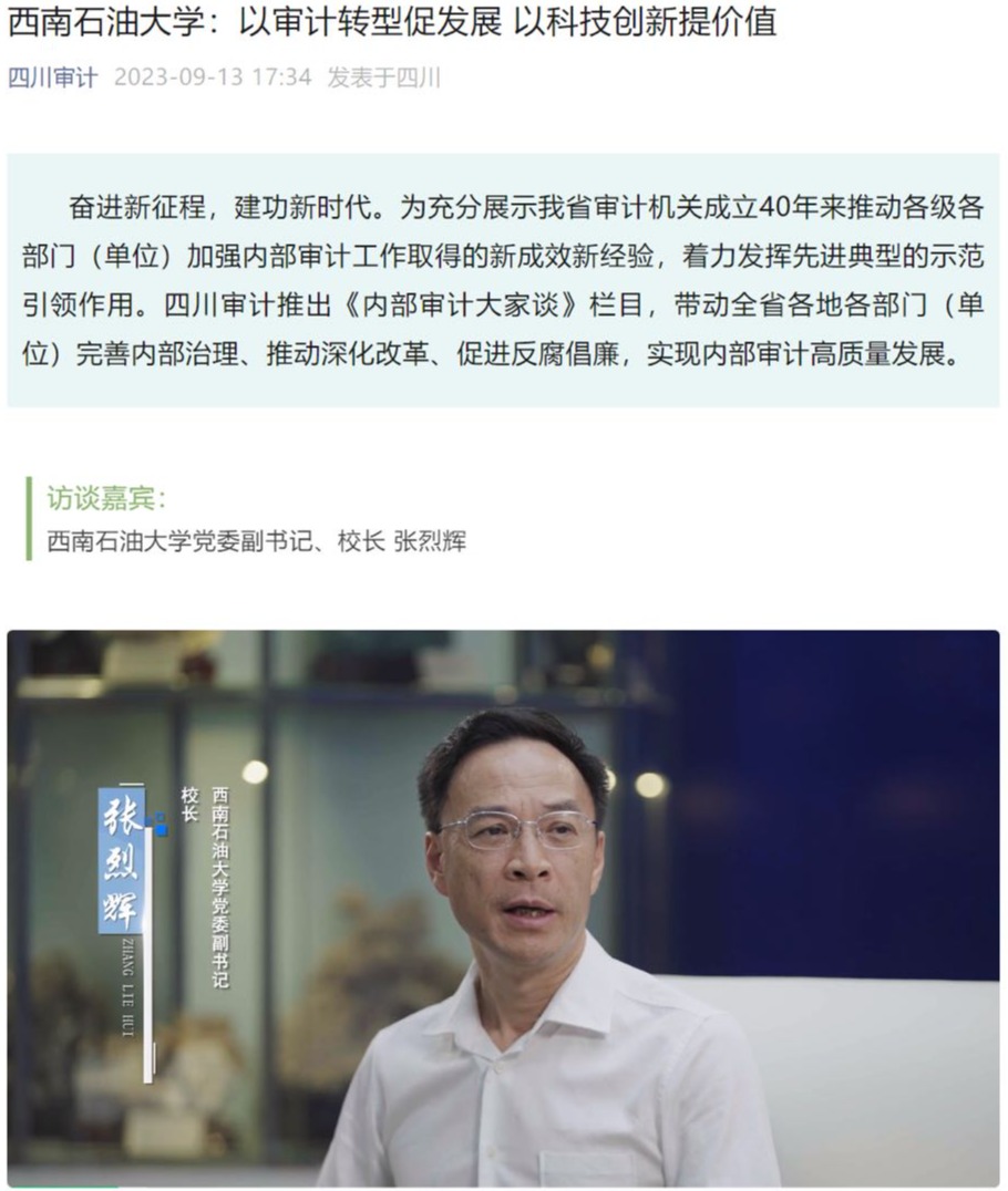 為總結(jié)提煉40年來我省各級審計機關(guān)和相關(guān)單位內(nèi)部審計工作取得的新成效新經(jīng)驗,展示廣大審計干部和內(nèi)部審計人員的新風貌,發(fā)揮先進典型的示范引領(lǐng)作用,四川省審計廳推出《內(nèi)部審計大家談》欄目。學校黨委副書記、校長張烈輝受邀參加該欄目視頻專訪,并作了“以審計轉(zhuǎn)型促發(fā)展 以科技創(chuàng)新提價值”的主題交流分享。