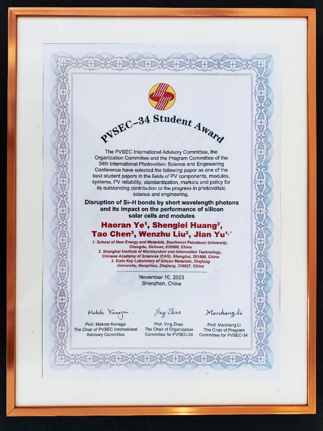 第34屆國際光伏科學與工程大會(PVSEC-34)于11月6日至10日在中國深圳舉行。我校新能源與材料學院(光伏新能源現代產業學院)研究生葉浩然所著論文“Disruption of Si-H bonds by short wavelength photons and its impact on the performance of silicon solar cells and modules”獲得大會最佳論文獎(PVSEC-34 Student Award)。