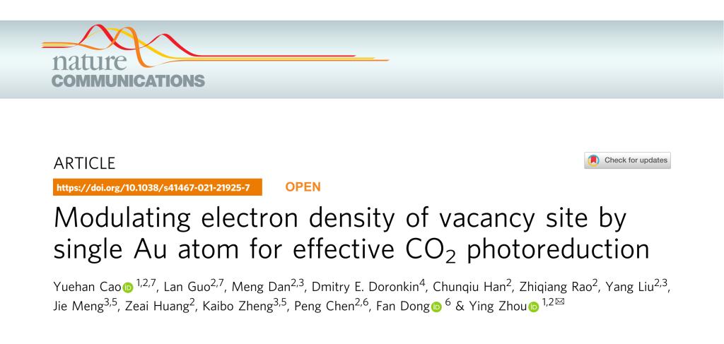 近日,Nature Communications(《自然-通訊》)以題為“Modulating electron density of vacancy site by single Au atom for effective CO2photoreduction”(利用單原子金調控空位處電子密度實現光驅動下CO2高效轉化),報道了我校太陽能驅動CO2資源化利用的最新進展。
