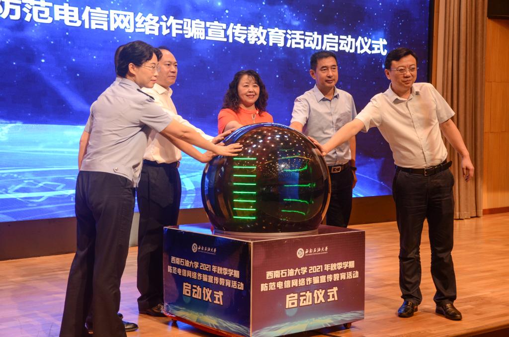 會議現場,校地雙方領導共同按下“啟動球”,正式開啟2021年秋季學期防范電信網絡詐騙宣傳教育活動。接下來,學校將建立全員參與、統籌聯動、密切協作、形成合力的反詐工作體系,多措并舉,確保反詐工作收到實效。