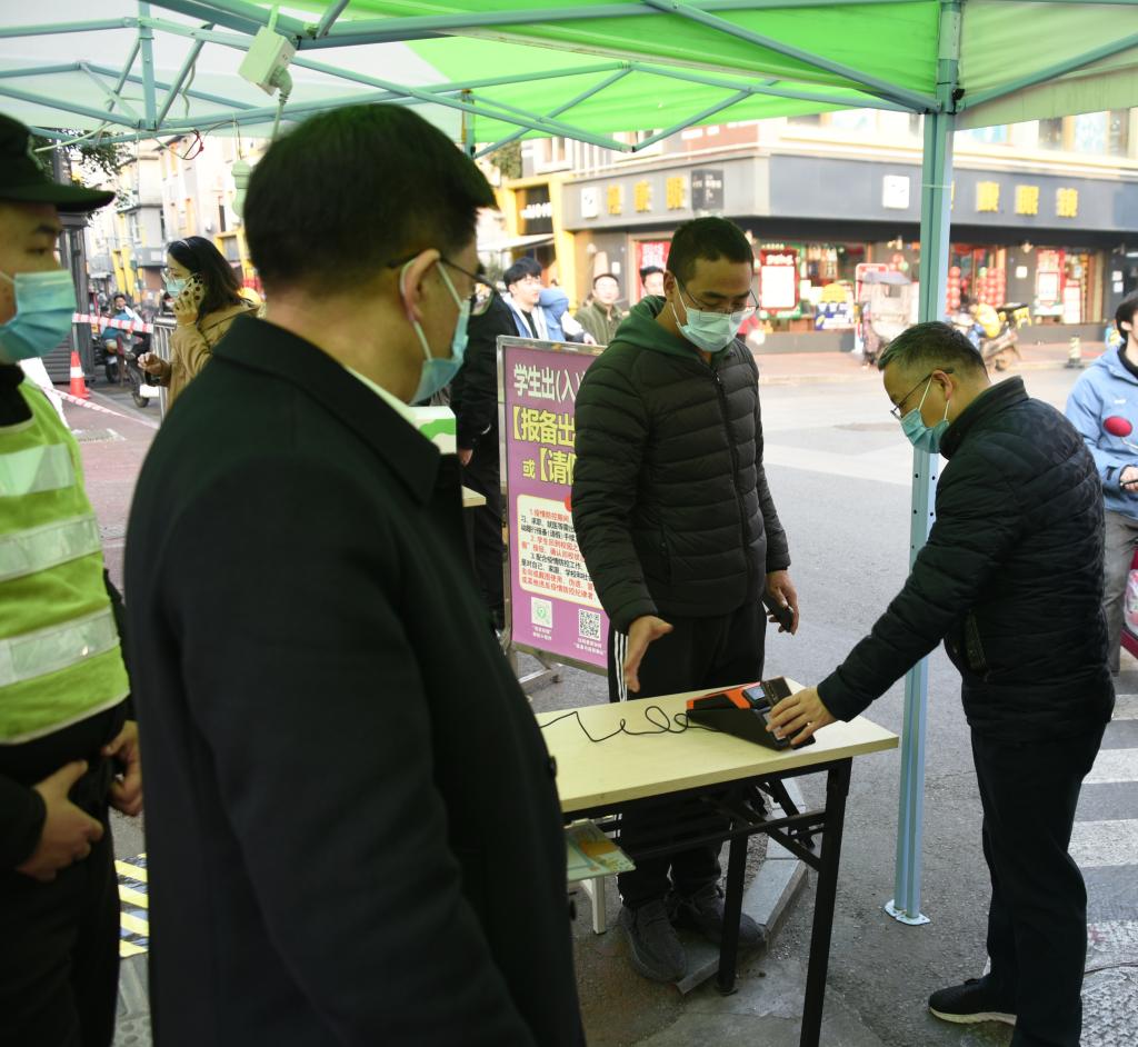 在東大門,檢查組認真查看了校內外考生入場專用通道是否暢通,是否嚴格執行入場規范、掃碼亮碼、測量體溫等規定,隨后深入普通考場、備用(隔離)考場、學生第一食堂等區域,實地檢查了各項疫情防控措施是否落地落實,叮囑各工作組負責人和現場工作人員務必要落實防控措施,做好考試服務,確保考生有序進入校園、安全到達考場。