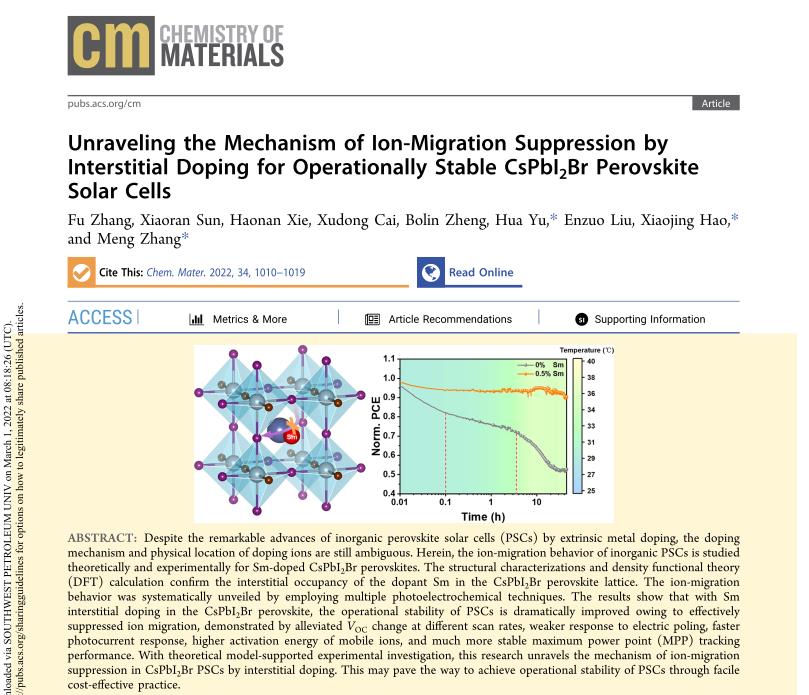 我校光伏產(chǎn)業(yè)技術(shù)研究院近期在間隙摻雜抑制無機(jī)鈣鈦礦太陽能電池離子遷移的機(jī)理研究方面取得新進(jìn)展,成果以論文“Unraveling the Mechanism of Ion-Migration Suppression by Interstitial Doping for Operationally Stable CsPbI2Br Perovskite Solae Cells”發(fā)表于國際期刊《Chemistry of Materials》。
