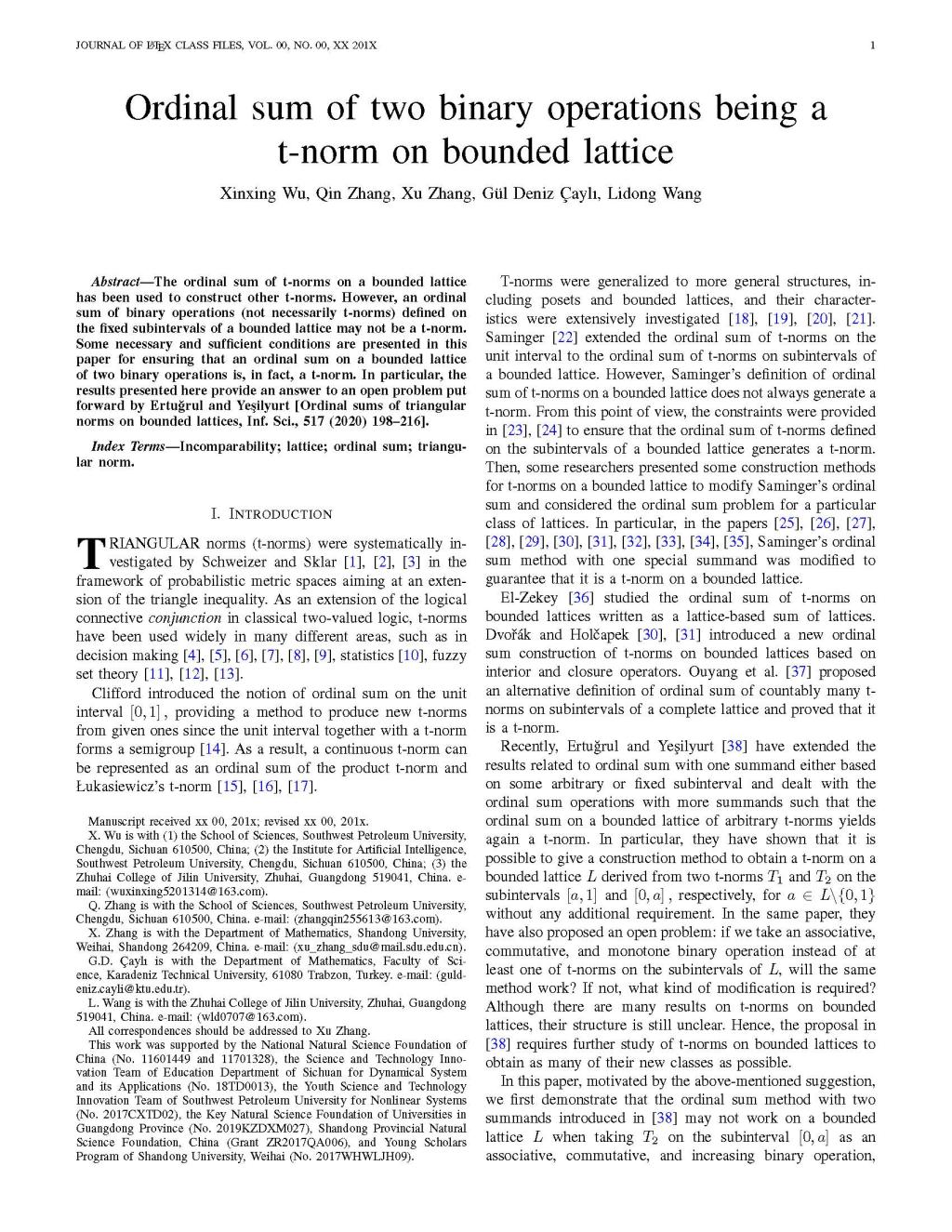 Xinxing Wu et al., Ordinal sum of two binary operations being a t-norm on bounded lattice, IEEE Transactions on Fuzzy Systems, DOI: 10.1109/TFUZZ.2021.3066120 (https://ieeexplore.ieee.org/document/9378943)
