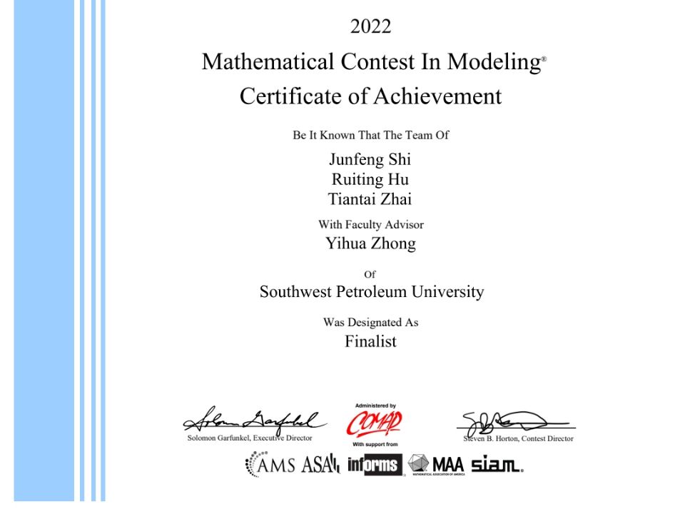 2022年美國大學生數學建模競賽獲獎證書