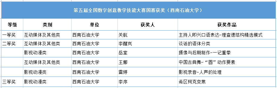 近日,第五屆全國數字創意教學技能大賽國賽圓滿收官,獲獎名單正式公布。在本屆賽事中,西南石油大學藝術學院共有6位教師獲得了國家級獎項,其中一等獎1項,二等獎4項,三等獎1項。