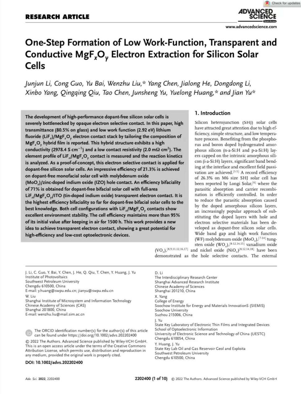 6月17日,光伏產業技術研究院黃躍龍、俞健團隊在國際知名期刊《Advanced Science》(SCI一區,影響因子16.8)發表了題為“One-step Formation of Low Work-function, Transparent and Conductive MgFxOyElectron Extraction for Silicon Solar Cells”的研究論文。