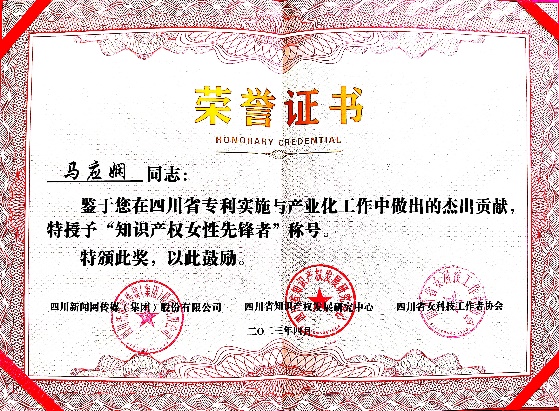 “知識產權女性先鋒者”由四川省新聞網、四川省知識產權發展研究中心聯合頒發,四川省總共有11名女性獲此殊榮。