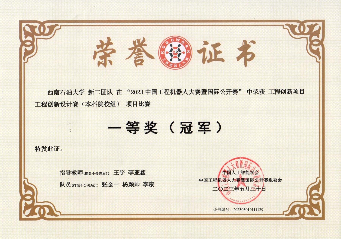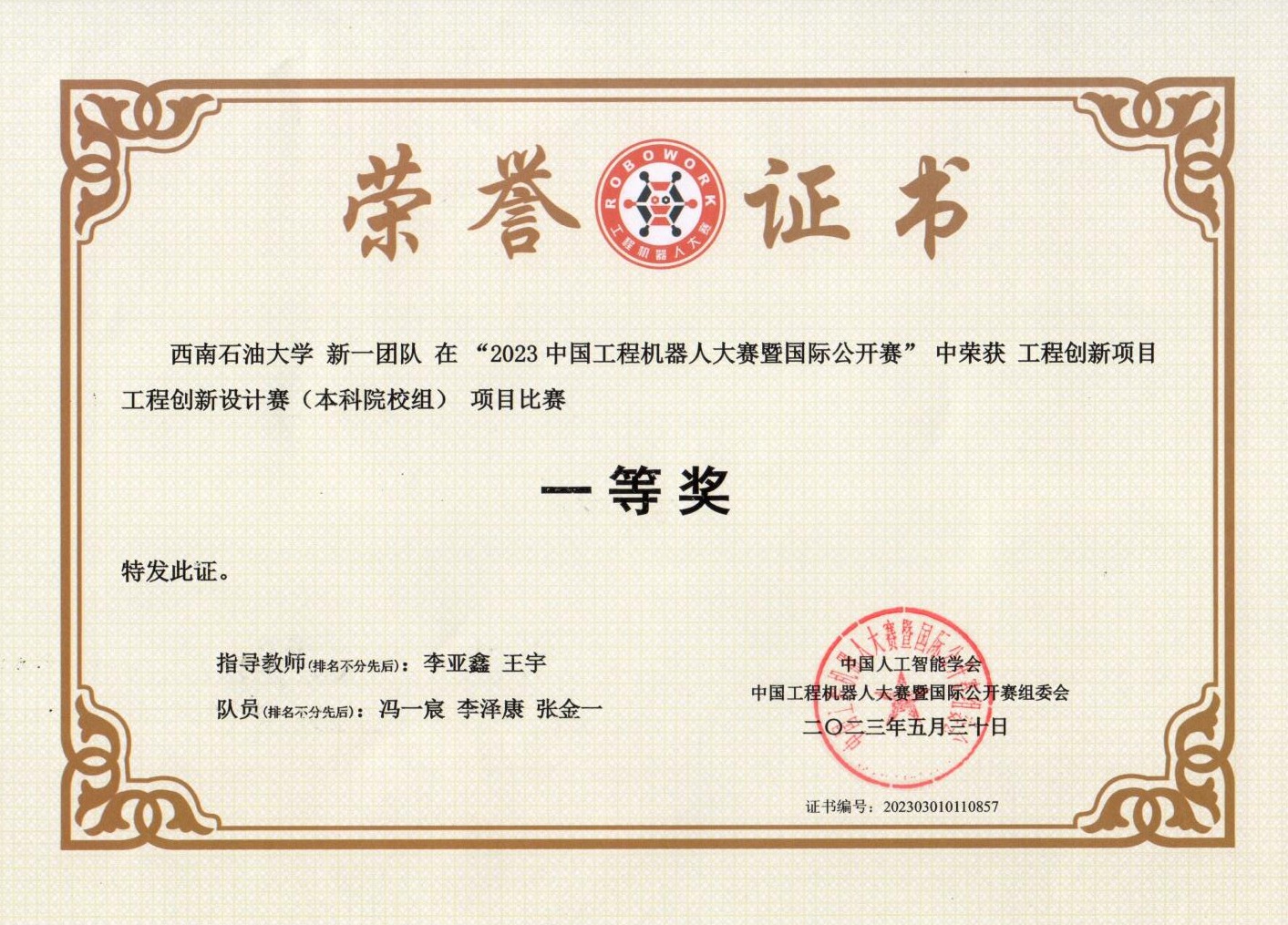 一等獎獲獎證書