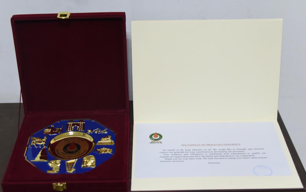 馬津·阿巴斯·卡里姆對(duì)學(xué)校給予伊拉克留學(xué)生的關(guān)心和支持表示感謝;對(duì)學(xué)校在“振華石油獎(jiǎng)學(xué)金項(xiàng)目”上付出的努力表示感謝;對(duì)學(xué)校助力伊拉克石油人才培養(yǎng)和未來(lái)產(chǎn)能建設(shè)戰(zhàn)略表示感謝。他遞交了伊拉克石油部給學(xué)校的感謝信,并和張烈輝代表雙方互贈(zèng)了禮物。在感謝信中,伊拉克石油部表達(dá)了對(duì)學(xué)校的敬佩和謝意。感謝學(xué)校給予伊方應(yīng)用型、復(fù)合型、國(guó)際化高素質(zhì)人才培養(yǎng)等方面的支持和貢獻(xiàn),期待雙方充分發(fā)揮各自優(yōu)勢(shì)與特色,取得更多進(jìn)步和成果。