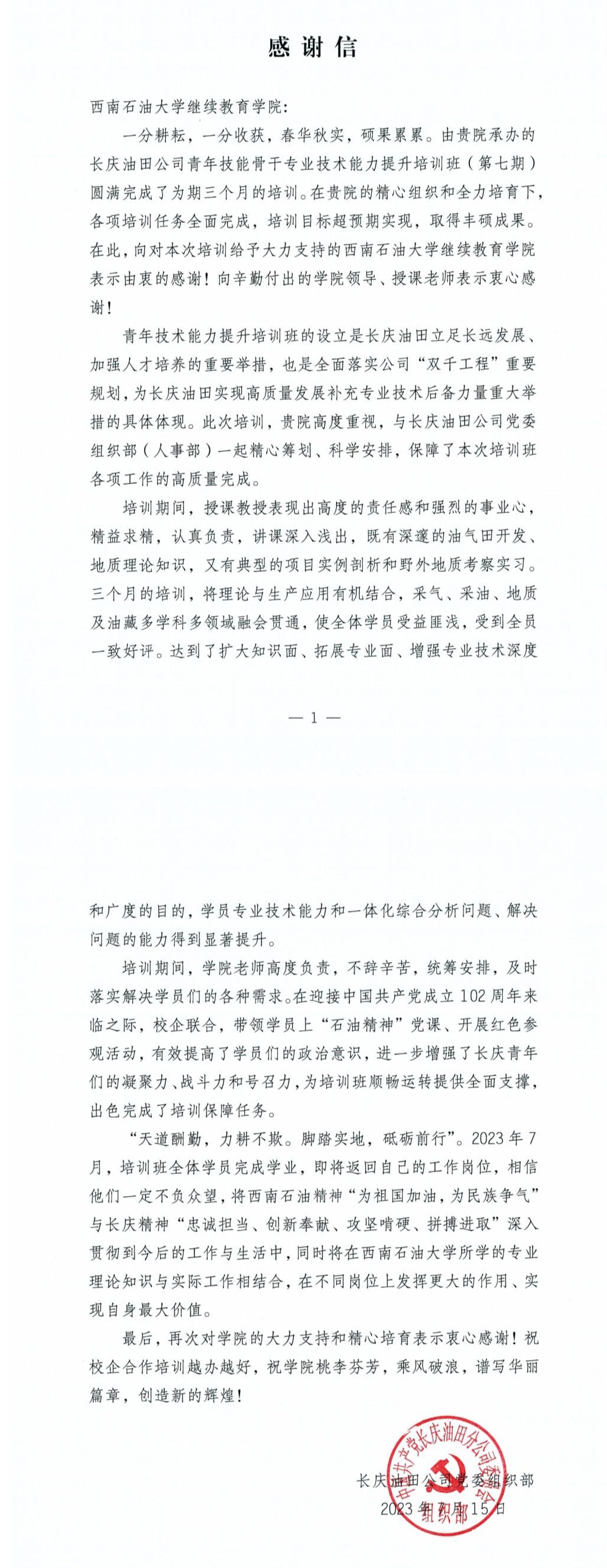 近日,長(zhǎng)慶油田公司黨委組織部向我校來信,對(duì)我校繼續(xù)教育學(xué)院在長(zhǎng)慶油田公司青年技能骨干專業(yè)技術(shù)能力提升培訓(xùn)班(第七期)舉辦期間,所給予的大力支持與付出的辛勤勞動(dòng)表示感謝。