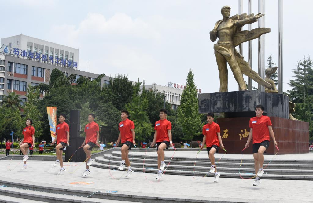 大運會火炬在我校傳遞期間,同學們在博學樓廣場的火炬傳遞加油站和石油魂雕塑下分別表演了歌舞串燒和花樣跳繩,向世界展示石大學子的激情與活力。
