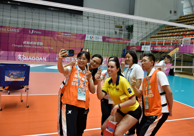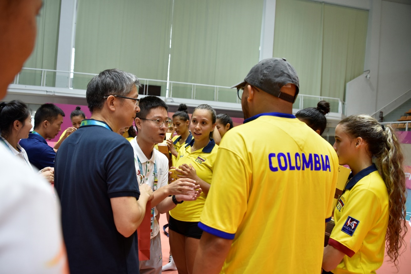 8月5日臨近中午時分,哥倫比亞隊即將離別,場館中心主任姚勇代表新都賽區委員會及場館中心,向哥倫比亞隊贈送了紀念品、禮物和盲盒。對方喜出望外,一名女隊員連忙拿出糖果分散給大家表示回敬。
