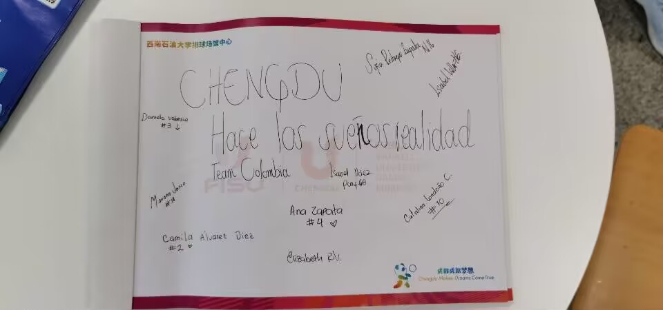 記者兩次探訪的時候,恰好都是哥倫比亞女排在此訓練。這是一支由安蒂奧基亞大學女排整建制組成的國家隊,是唯一來過這里三次的隊伍。他們對中方的服務感到非常滿意,一隊員用他們本國的語言在留言簿寫下“成都,讓夢想成真”。