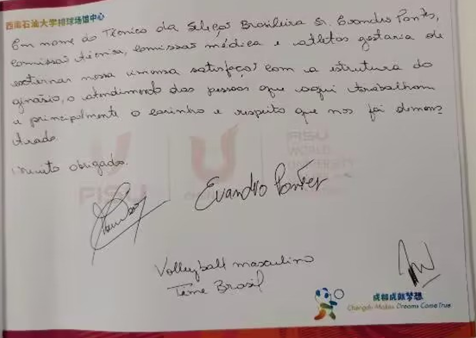 葡萄牙男排隊員:我謹代表葡萄牙男排,并以我個人的名義,感謝貴方的支持與善意。來成都參加世界大學生運動會真是一段奇妙的經歷。今天的訓練更是讓我們感到錦上添花。謝謝您們所做的一切,謝謝您們饋贈的禮物。祝您們一切順利。
