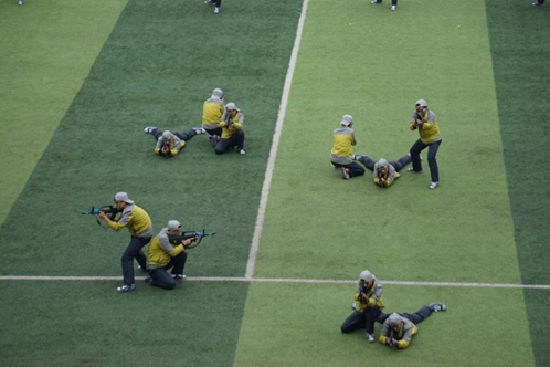新生軍訓匯報表演在莊嚴的國歌聲中拉開了帷幕。分列式方隊的同學們邁著整齊的步伐走過了主席臺后,在這些新生中,藝術學院的新生顯得格外引人注目,他們器宇軒昂,精神豪邁,展現出了我們藝術學院學子的風采與魅力。我院16級的百余名新生分屬女子匕首術方陣和擒敵方陣。在匕首術的表演中,藝術學院的姑娘們化身巾幗英雄,一招一式,英姿颯爽。雖然單薄的軍訓服難以抵擋入冬的寒風,但藝術學院“紅色娘子軍”們的斗志卻絲毫沒有渙散,哪怕是面對雨后積水的地面也能毫不猶豫地伏地完成動作。揮刀、隱鋒、掃腿、怒刺…一招一式有模有樣,盡顯巾幗英姿。