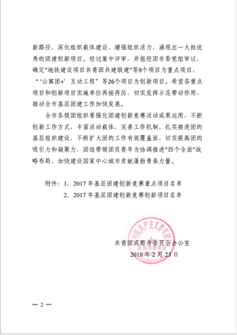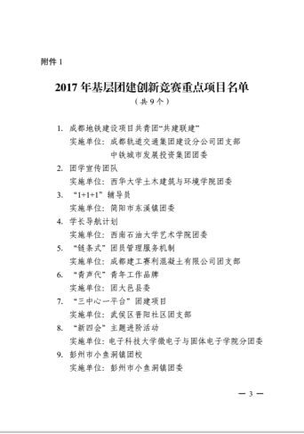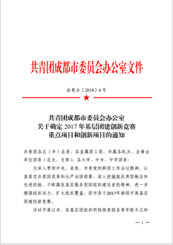 近日,共青團成都市委辦公室下發了成青辦[2018]4號《共青團成都市委員會辦公室關于確定2017年基層團建創新競賽重點項目和創新項目的通知》,藝術學院團總支申報的“學長導航計劃”項目被確定為基層團建創新競賽重點項目。