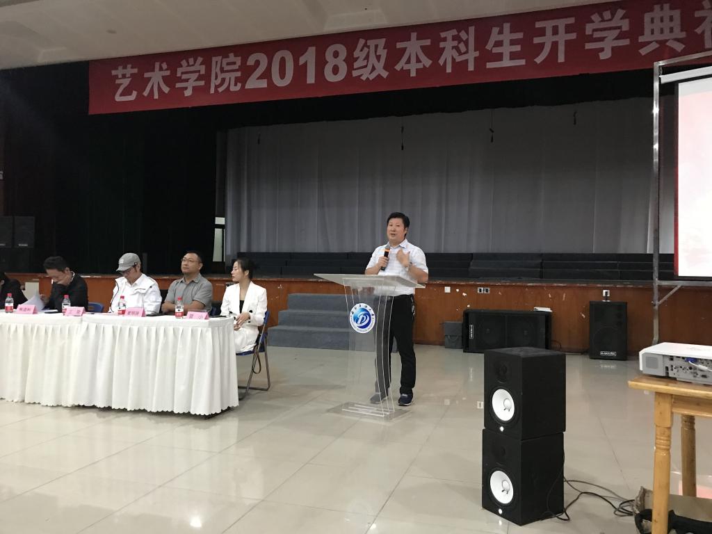 典禮開始,全場起立奏唱國歌。面對朝氣蓬勃的新生,藝術學院黨總支副書記何姍老師作為本次開學典禮的主持人,對成功走過高考獨木橋進入心儀學府的各位新同學表示祝賀并向大家介紹到場的院領導和授課教師代表。隨后,藝術院院長焦道利上臺講話,希望大家不負韶華,作為一名大學生,是中國的新生力量,也是未來祖國發(fā)展的主要動力,抓住寶貴難得的學習環(huán)境與資源是接下來四年的生活中最主要的任務,希望新生們能夠使自己的才能得到展示,抓緊時間充實自我并擔起創(chuàng)造未來的重任。教師代表李民在發(fā)言中強調了書籍對構成完善知識體系的重要性,一切的藝術創(chuàng)造都需要文化的沃土,這是我們不能忽視的根基。學生代表,團總支學生會主席涂正寧同學發(fā)表講話,作為大三“老”學長分享了自己這三年來的成長與蛻變,將其總結為態(tài)度與情懷,他認為心靈的強大是我們奮斗最堅穩(wěn)的后盾。最后,新生代表張晨曦上臺發(fā)言,表達了對初入大學懵懂無知的他們處處幫助的各位老師以及學長學姐們的衷心感謝以及對未來大學生活的無限憧憬。