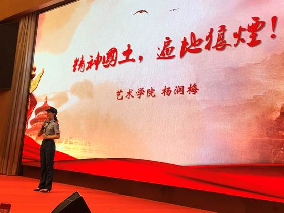 本次比賽,共有來自各院的15組選手參加。比賽過程中,我院兩名學生結合各自生活經歷,以自己切身體會向在場觀眾講述了對國防強軍的感悟。并結合我國當前國際形勢和熱點問題,娓娓道來,展望新時代。最終,楊潤梅同學以生動的語言、較強的感染力贏得比賽第一名。