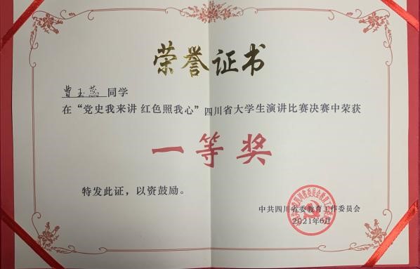 2021年6月17日,“黨史我來講、紅色照我心”四川省大學生演講比賽決賽在四川師范大學舉行。我院2019級播音與主持藝術專業曹玉蕊同學在本次大賽中獲得四川省一等獎。