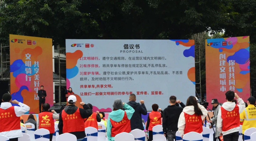 “時(shí)代發(fā)展,瞬息萬(wàn)變。我們正在經(jīng)歷“百年未有之大變局”。今天,在創(chuàng)建全國(guó)文明典范城市的關(guān)鍵時(shí)期,新都區(qū)黃桷樹廣場(chǎng)開展“文明騎行,共享美好生活”活動(dòng),本次活動(dòng)目的在于推動(dòng)我區(qū)共享單車有序健康發(fā)展,深化文明綠色交通行動(dòng),進(jìn)一步提升城市文明程度,為美麗香城、文明香城做出應(yīng)有貢獻(xiàn)。”成都市新都區(qū)綜合行政執(zhí)法局黨組書記、局長(zhǎng)鄭旭恩說(shuō)到。