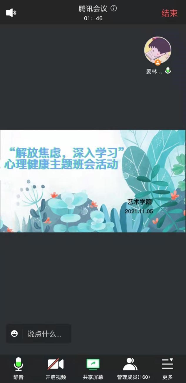 現如今許多同學都會產生學習焦慮、職業焦慮,社交問題也接踵而至,關注大學生心理健康問題尤為重要。為幫助同學緩解學習壓力,交流學習經驗,更積極的面對大學生活中遇到的問題,11月5號,藝術學院開展了線上班級心理健康主題班會活動。