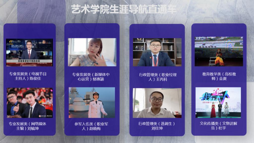 為樹立生涯就業(yè)成功典型,打通學(xué)生成長任督二脈,藝術(shù)學(xué)院特開展“雙核協(xié)同”——生涯導(dǎo)航直通車活動,選取優(yōu)秀畢業(yè)生中的基層選調(diào)生、新媒體編輯、教師、職業(yè)軍人等多種類型線上開展優(yōu)秀校友回訪工作,并邀請拍攝“生涯直通車”系列視頻,引導(dǎo)低年級學(xué)生樹立職業(yè)愿景。
