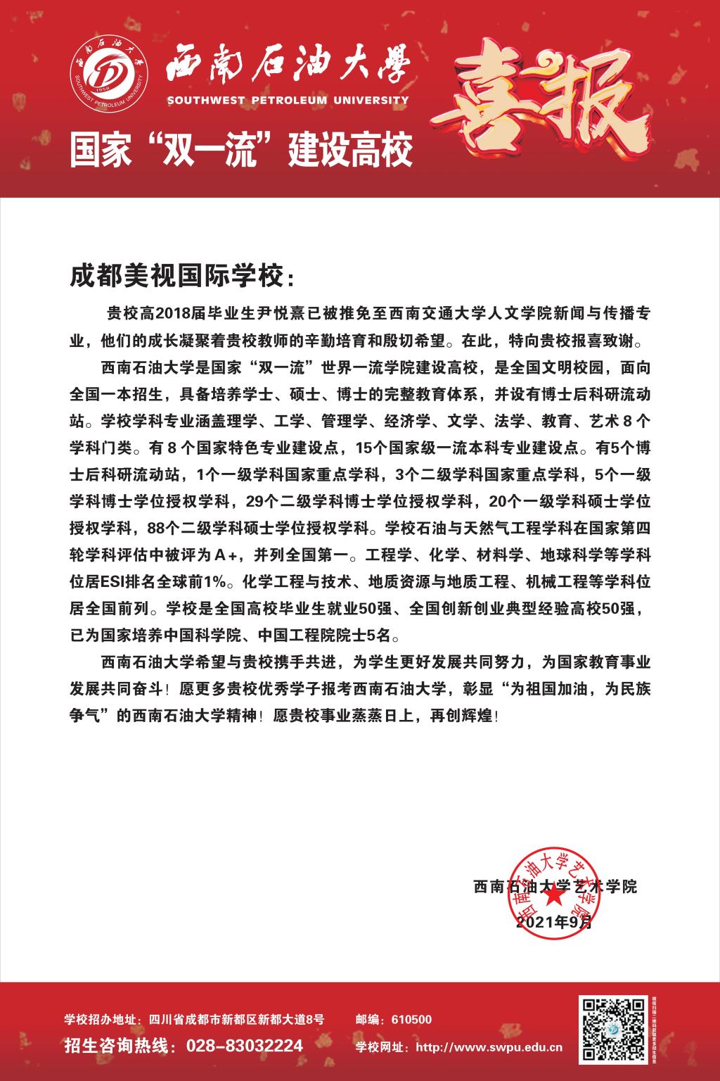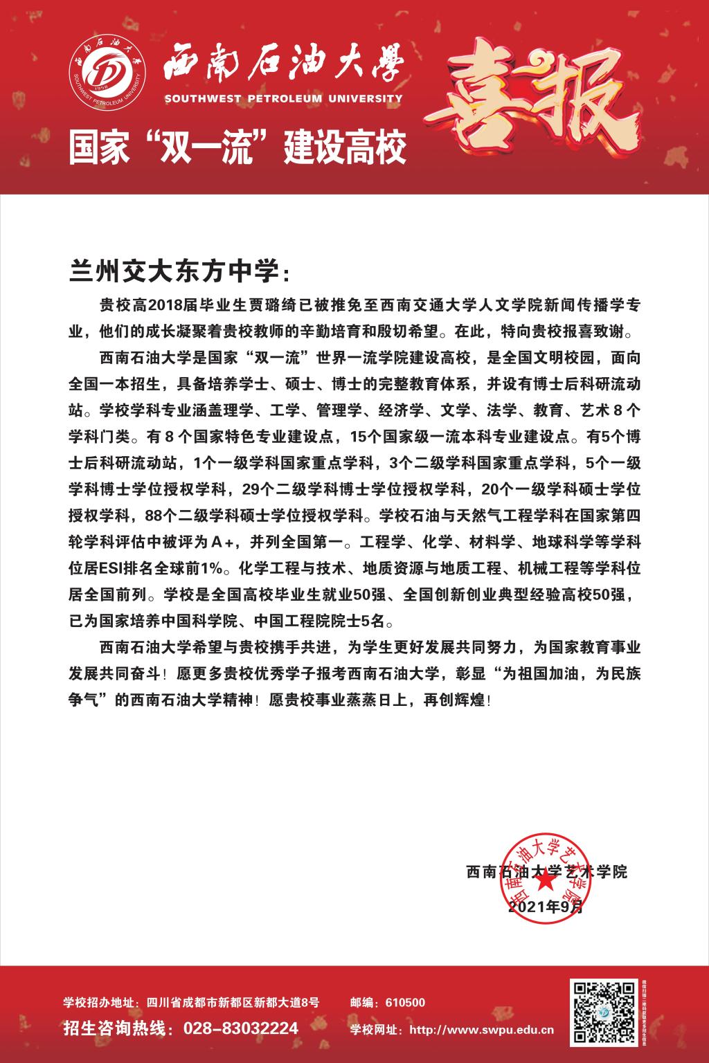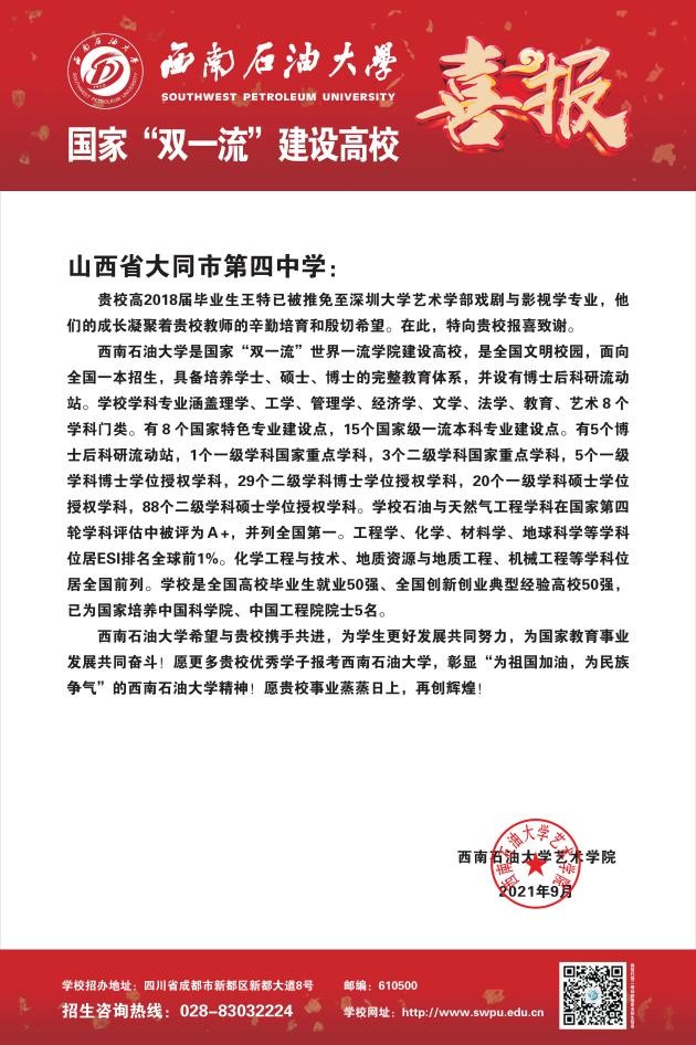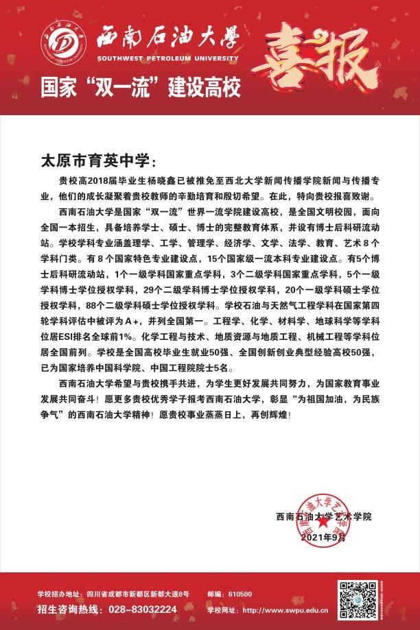 藝術學院向2021年推薦免試攻讀研究生學生高中母校寄送喜報!