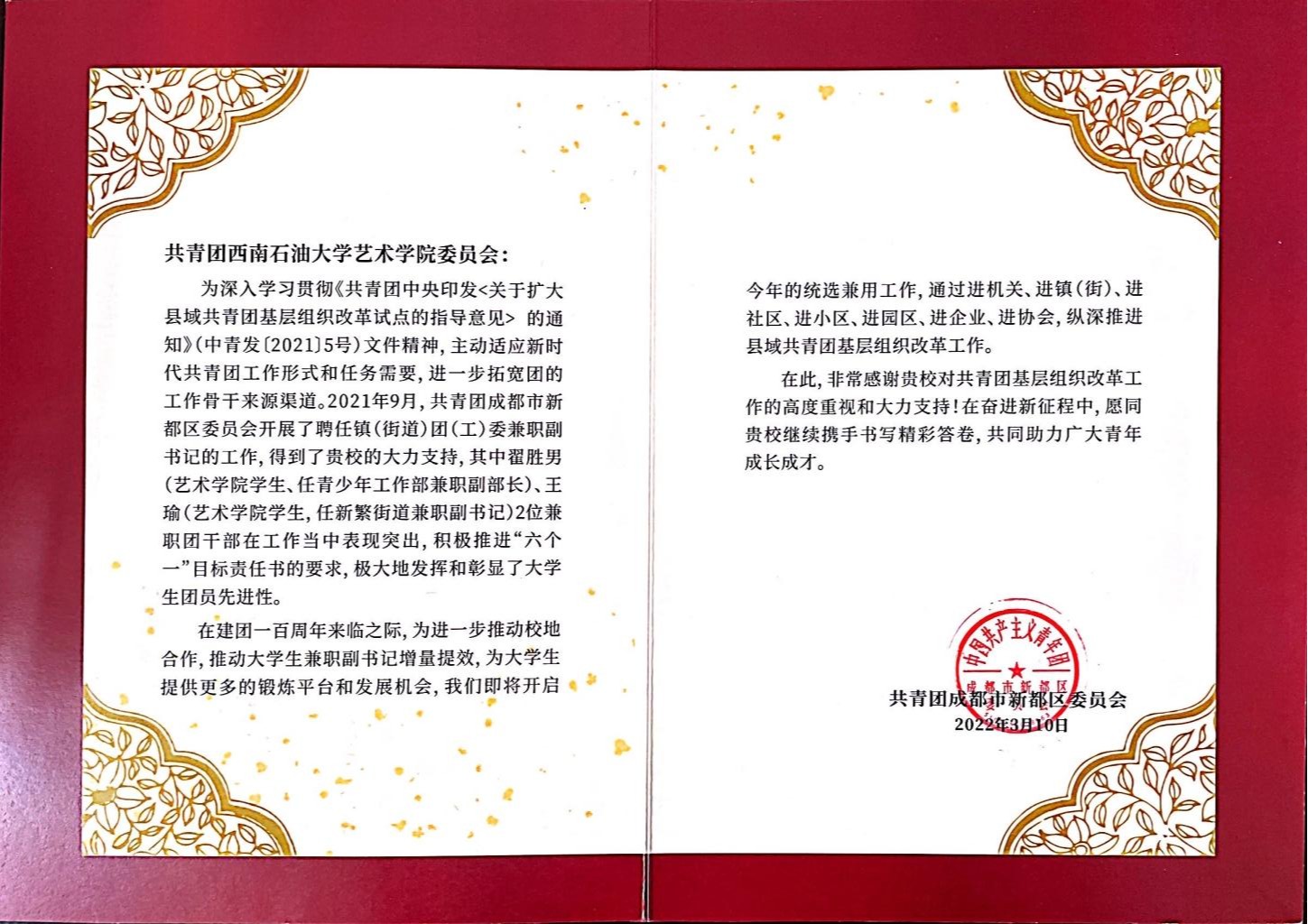 “非常感謝貴校對(duì)共青團(tuán)基層組織改革工作的高度重視和大力支持!在奮進(jìn)新征程中,愿同貴校繼續(xù)攜手書(shū)寫(xiě)精彩答卷,共同助力廣大青年成長(zhǎng)成才。”這是近期藝術(shù)學(xué)院收到的一封來(lái)自共青團(tuán)新都區(qū)委的感謝信內(nèi)容,原因是這樣的……