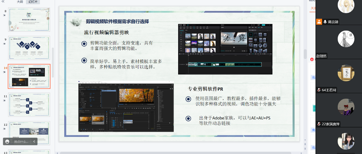 圖文制作組負責人主要介紹了word等辦公軟件的基本操作方法,講解了基本的攝影技巧和圖片拍攝要求,并對文稿的內容與格式做出規定;排版運營組負責人主要介紹如何使用秀米進行排版編輯工作,包括圖片篩選、美化格式、模板使用等多個方面;視頻組組長向同學們介紹了視頻前期策劃流程和多款常用的剪輯軟件,解答了同學們提出的諸多問題。
