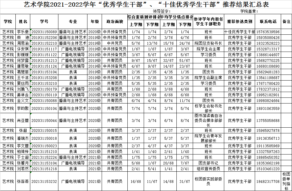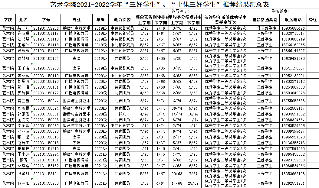 根據(jù)《關(guān)于做好西南石油大學(xué)2021-2022學(xué)年學(xué)生先進個人和先進集體評選表彰工作的通知》、《西南石油大學(xué)本科學(xué)生獎勵辦法》、《西南石油大學(xué)本科學(xué)生先進班級評選辦法》的相關(guān)要求,藝術(shù)學(xué)院開展了2021-2022學(xué)年學(xué)生先進個人和先進集體的評選工作,經(jīng)過個人申報、班級申報、資格審核等工作,現(xiàn)將評選結(jié)果公示如下: