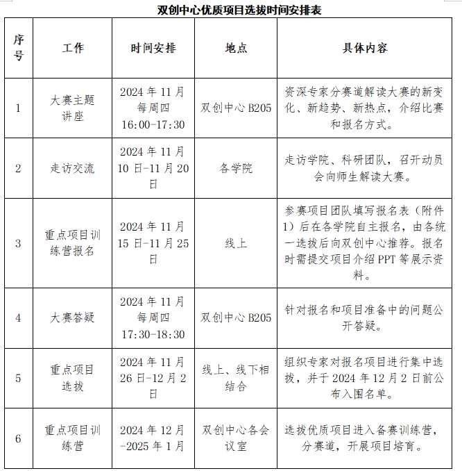 學(xué)院上報(bào)后,雙創(chuàng)中心組織專(zhuān)家對(duì)報(bào)名項(xiàng)目進(jìn)行集中選拔,并于2024年12月2日前公布入圍名單,入圍項(xiàng)目統(tǒng)一參加優(yōu)質(zhì)項(xiàng)目訓(xùn)練營(yíng)。