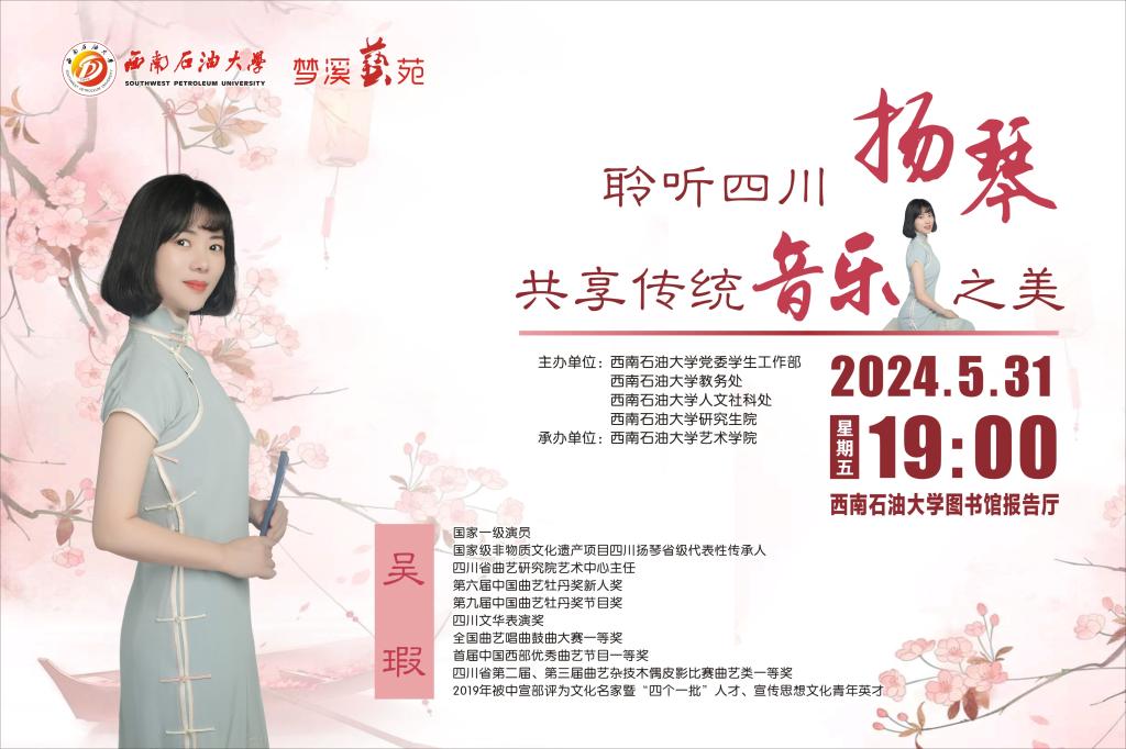 以“聆聽四川揚(yáng)琴 共享傳統(tǒng)音樂之美”為主題,旨在通過深入介紹四川揚(yáng)琴的歷史、藝術(shù)特點(diǎn)以及演唱技巧,圍繞四川揚(yáng)琴曲藝的起源、發(fā)展、特點(diǎn)、藝術(shù)價(jià)值等展開介紹,帶領(lǐng)大家領(lǐng)略傳統(tǒng)曲藝的獨(dú)特魅力。隨著時(shí)代的發(fā)展和文化的交流,傳統(tǒng)曲藝面臨著前所未有的挑戰(zhàn)和機(jī)遇。通過本次講座,希望能夠讓更多的人了解和喜愛傳統(tǒng)曲藝,共同推動(dòng)中華優(yōu)秀傳統(tǒng)文化的傳承與發(fā)展。