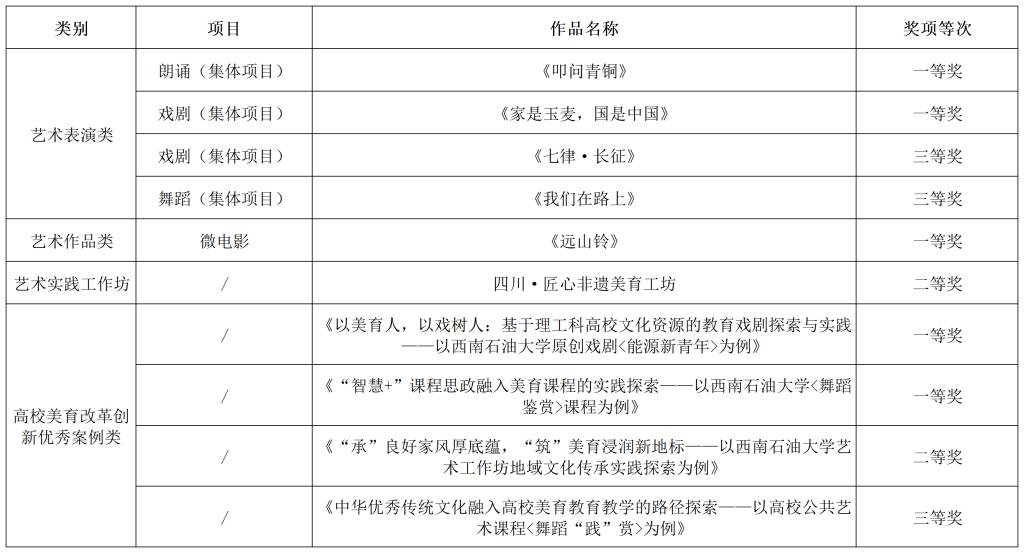 四川省大學生藝術展演活動是全省大學生藝術教育最高水平的展示,本屆展演活動以“厚植家國情懷,涵養進取品格”為主題,全省134所高校在讀的研究生、本??粕謩e圍繞聲樂、器樂、舞蹈、戲劇、朗誦、繪畫、設計、攝影、微電影等多個藝術門類同臺競賽,共收到藝術表演類作品663個、藝術作品559件、藝術實踐工作坊作品91個、美育改革創新案例284份。我院選送的作品中有2個藝術表演作品、1部微電影作品、2篇高校美育改革創新優秀案例進入最終現場展演環節。