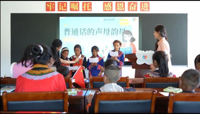 青春同繪推普夢,民族團結一家親。普繪推普團隊不畏艱辛,跨越千山萬水,遠赴新疆輪臺縣,深入四川涼山腹地,讓孩子們感受國家通用語言文字的魅力。在那里,孩子們的眼神中閃爍著對知識的渴望,卻因方言的隔閡而難以觸及更廣闊的世界。宣講團的師生們耐心細致地教授每一個音節,用生動的語言講述時代故事,為孩子們播下文化認同的種子。在普通話的課堂上,孩子們從羞澀到自信,從不敢開口到流利表達,每一次進步都凝聚著宣講團師生的心血與汗水。他們鼓勵孩子們講述家鄉的故事,讓鄉村振興的巨變被更多人聽見。為了將這份愛心與責任延續下去,團隊與當地簽約共建推普實踐教育基地,助力鄉村振興,為鑄牢中華民族共同體意識貢獻青春力量。