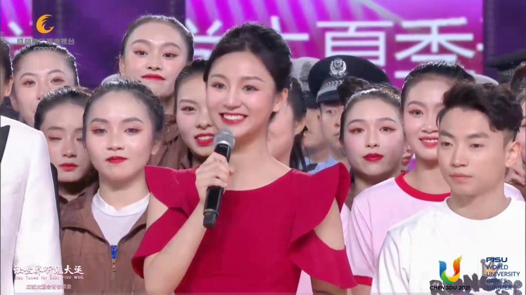 值得一提的是,我院播音1901班唐璇同學(xué)通過層層選拔,最終以大學(xué)生主持人的身份,登上了本次青春歌會(huì)的舞臺(tái),與兩位成都電視臺(tái)資深主持人及一位英國籍雙語主持人同臺(tái)主持,并獻(xiàn)唱大運(yùn)會(huì)歌曲《蓉光》。