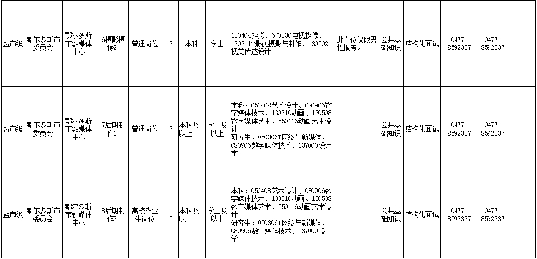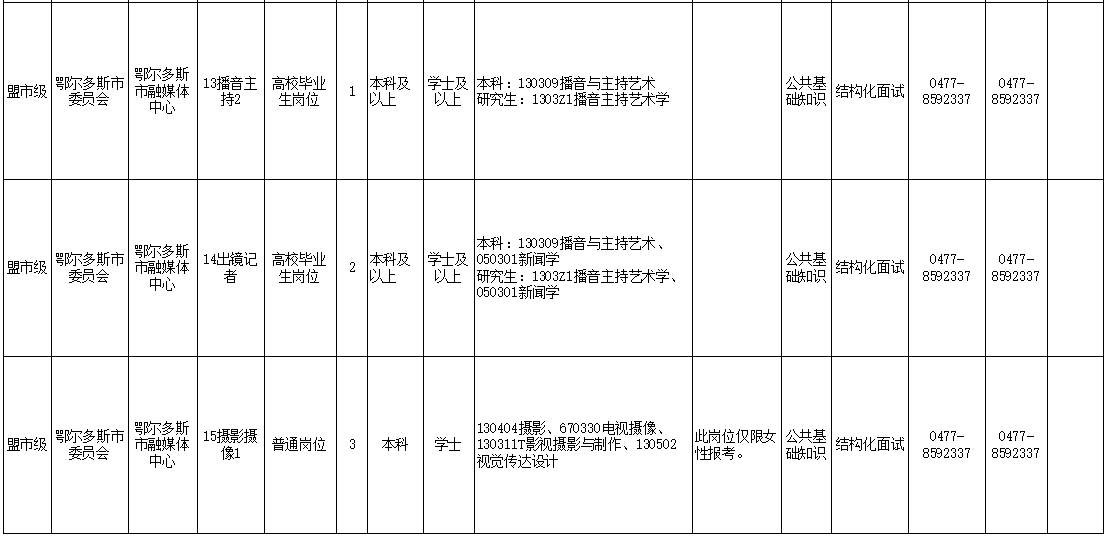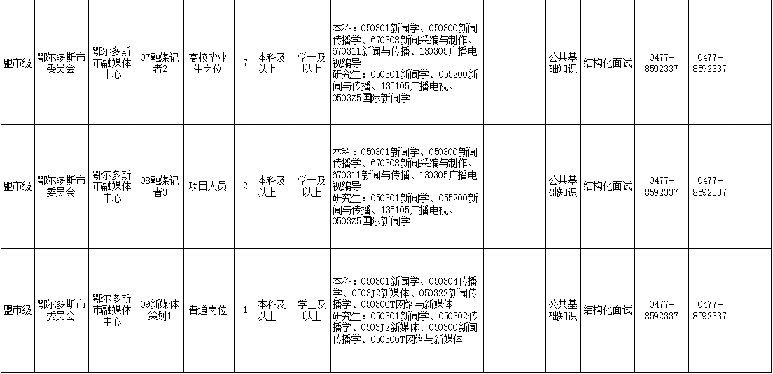 3.筆試開考比例(崗位招聘計劃數與應聘人數之比)為1:3。報名結束后,未達到規定比例的招聘崗位,核減招聘人數或取消招聘崗位,并在鄂爾多斯市人力資源和社會保障局官網發布變更公告。報考被取消崗位并初審通過的人員可以改報其他崗位或放棄報名,改報時間為2024年12月9日9:00—11:00。改報結束后,因無人報考取消的崗位,在鄂爾多斯市人力資源和社會保障局官網上公布。