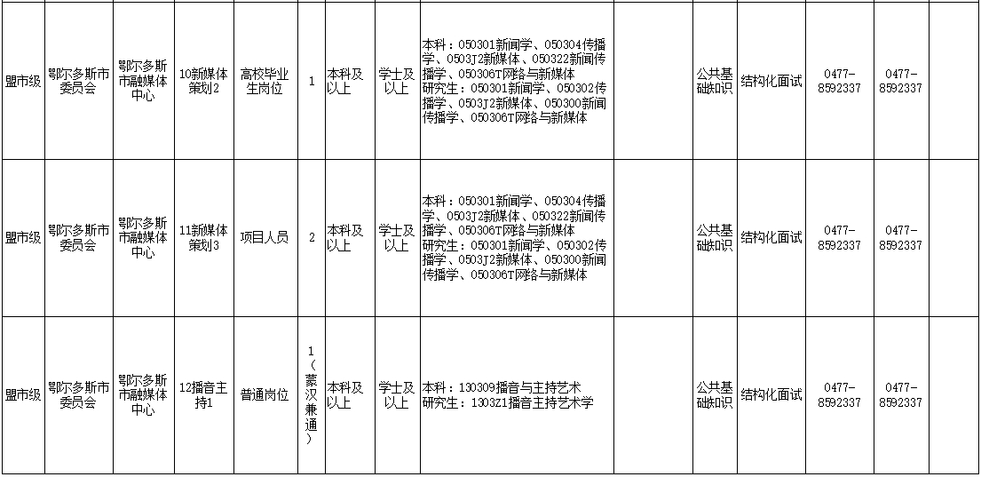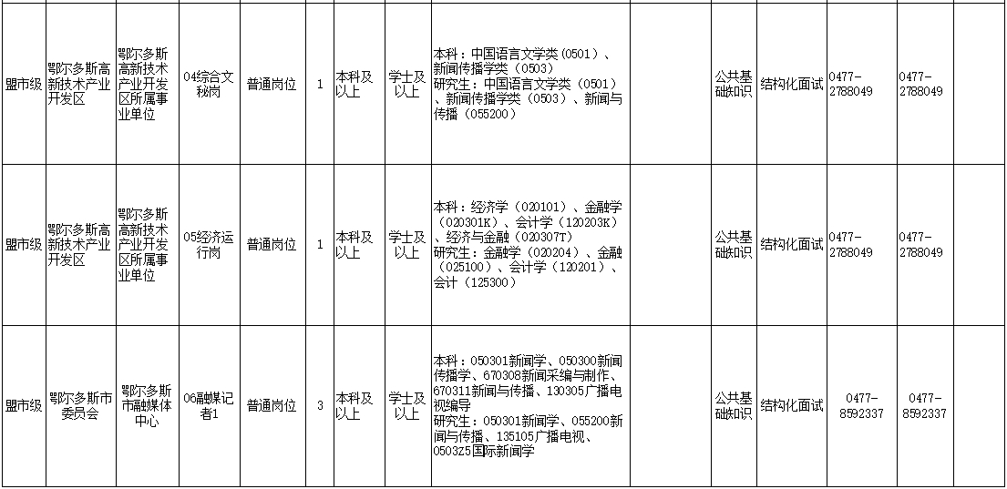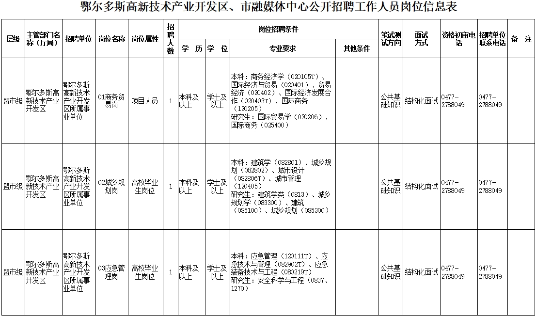 根據內蒙古自治區人力資源和社會保障廳 內蒙古自治區黨委組織部《關于印發<內蒙古自治區事業單位公開招聘人員辦法>的通知》(內人社辦發〔2022〕2號)和《內蒙古自治區2024年度事業單位公開招聘工作人員公告》精神,按照編制部門下達的公開招聘計劃,經研究,決定開展鄂爾多斯市高新技術產業開發區、市融媒體中心公開招聘控制數人員工作,現將有關事項公告如下。