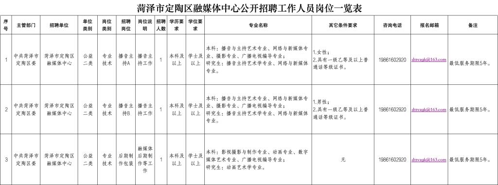 1.菏澤市定陶區融媒體中心公開招聘工作人員崗位一覽表