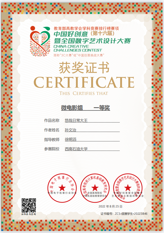 2022年8月25日,第十六屆中國好創意大賽國賽獲獎信息正式公布,藝術學院共有七部師生作品獲獎,一等獎四項、二等獎兩項、三等獎一項。