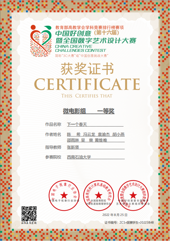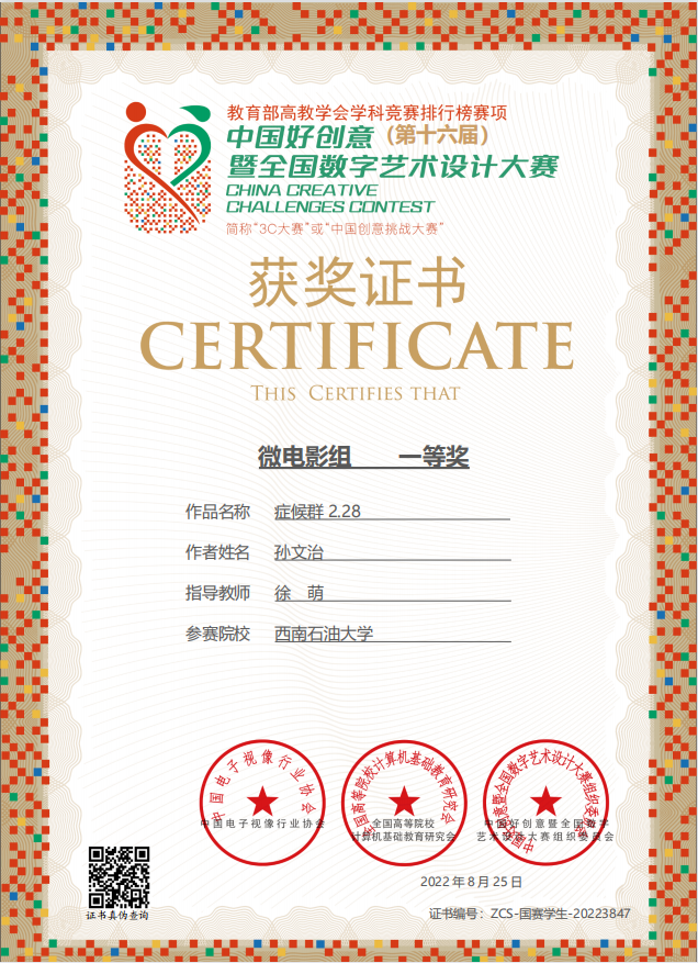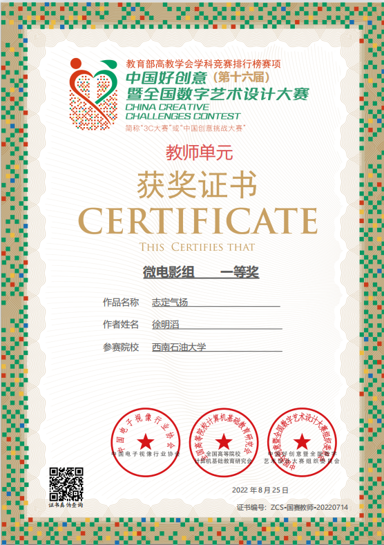 其中,徐明滔老師的作品《志定氣揚》獲得教師組一等獎;徐明滔老師指導,孫文治同學作品《悠哉日常大王》獲學生微電影組一等獎;徐萌老師指導,孫文治同學作品《癥候群2.28》獲學生微電影組一等獎;張新賢老師指導,陳希同學團隊作品《下一個春天》獲學生微電影組一等獎;江霄老師指導,劉書慧同學團隊作品《棉花與鋼》獲學生微電影組二等獎;江霄老師指導,張樂同學團隊作品《跳著走回來》獲學生微電影組二等獎;江霄老師指導,汪思宇同學團隊作品《起腔》獲學生微電影組三等獎。