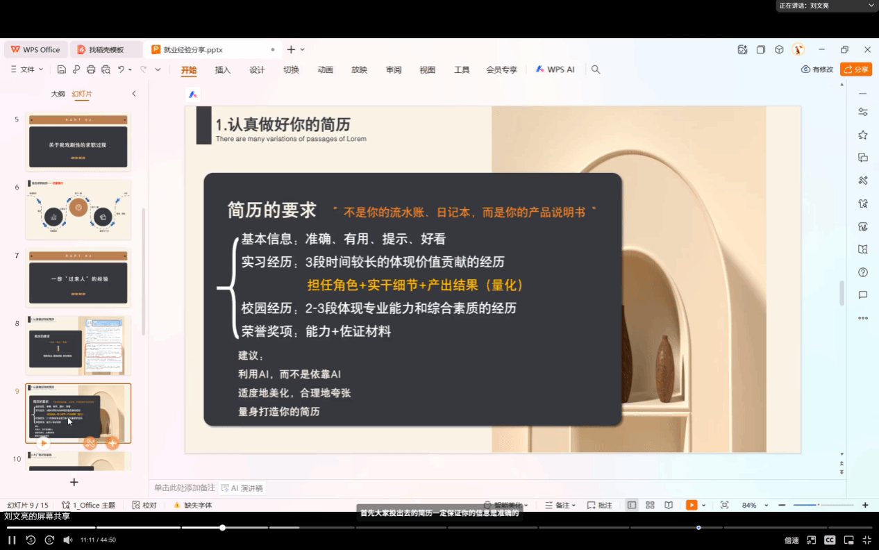 針對簡歷制作,劉文亮提出“一頁紙、一遍過、一眼看”的核心原則,強調簡歷需突出量化成果,如視頻播放量提升、項目參與成效等。同時,基本信息要準確簡潔,可添加“雙一流”“省重點專業”等提示性備注,使招聘方快速捕捉核心優勢。