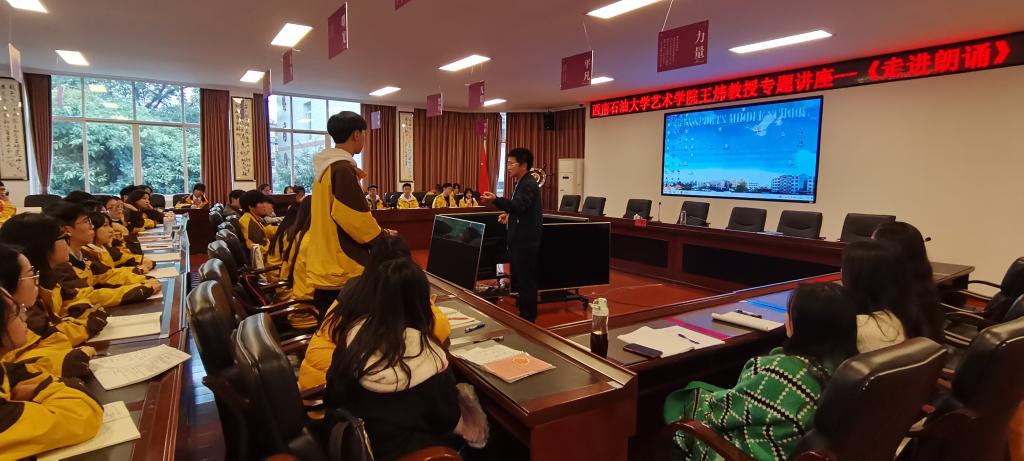 王教授從普通話聲母、韻母、聲調、朗讀情感四個方面做了詳細的講解,針對學生情感、氣息、發(fā)音等方面做了具體的指導,王教授或以深入淺出的講解、或以激情的朗誦、或以深情的吟誦,邊講邊指導,達到“學中用,用中學”的效果。