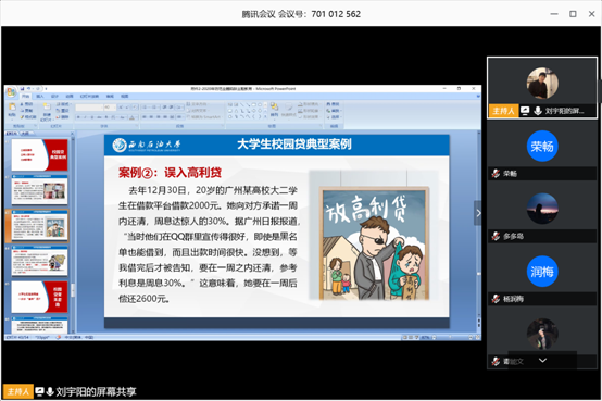 4月14日至4月17日藝術(shù)學院各年級分班級在輔導員老師的組織下通過微信群討論、騰訊會議、釘釘?shù)刃问皆诰€上召開主題教育“云”班會在線學習教育活動,引導學生樹立總體國家安全觀,增強國家安全意識,充分認識電信詐騙及非法網(wǎng)貸的危害,提高防范意識。