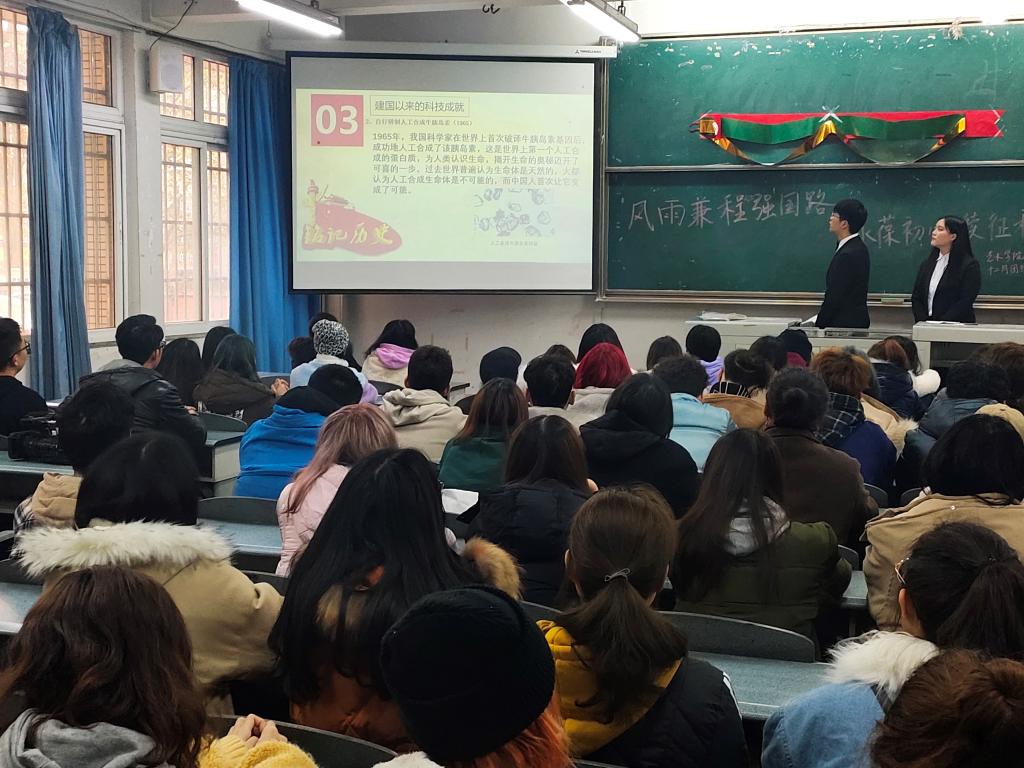 回答問題結束后,主持人開始詳細講解我國開國歷史、科技成就和我在未來的戰略,同學們悉心傾聽,認真理解。