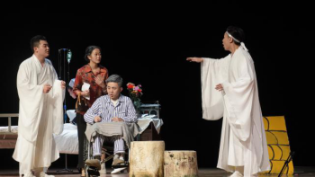 《桃花源》則是一出古裝喜劇,武陵漁夫老陶的妻子春花與房東袁老板私通,老陶出走桃花源,待他回到武陵后,春花與袁老板成家,卻發現原本如膠似漆的春花與袁老板已經陷入了現實的糾葛與相互的怨懟之中,并未過著想象中的幸福美滿的快樂生活。
