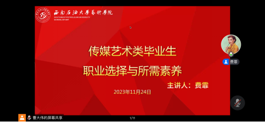 11月24日,藝術學院家校共育系列講座活動特邀傳媒專業教師費霏老師,為廣大同學帶來《傳媒藝術類畢業生職業選擇與所需素養》專題線上講座。藝術學院2020級全體同學與輔導員曹大偉老師參加本次講座。