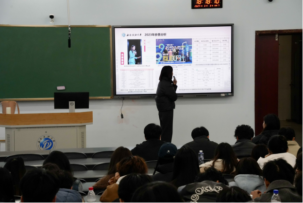 議而有思,思而行遠;行遠自邇,篤行不怠。朱蕊對2022級學生2023-2024學年秋季學期學情分析進行闡述,從學習狀態總體情況分析、學分績點GPA分析、進步情況及原因分析、不及格率及補考率、考試不及格原因分析等房嗎進行分析,鼓勵同學們在新學期積極進取,百尺竿頭更進一步。她進一步展示了2022級同學在上個學期取得的參賽成績,要求同學們在學期把握參賽重點,用心付出打造好作品。隨后,朱蕊強調,大家要認真對待自己的每一堂課,調整好狀態,迎接新學期的課程,提前準備好課表、設置好鬧鐘,提高課堂效率。