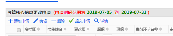 1、每個(gè)考籍管理的申請(qǐng)都有其申請(qǐng)的時(shí)間,考生只能在對(duì)應(yīng)的時(shí)間范圍內(nèi)進(jìn)行操作,時(shí)間范圍外只能查看數(shù)據(jù),如圖。