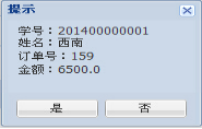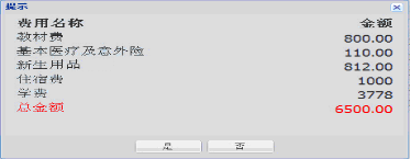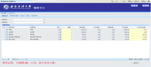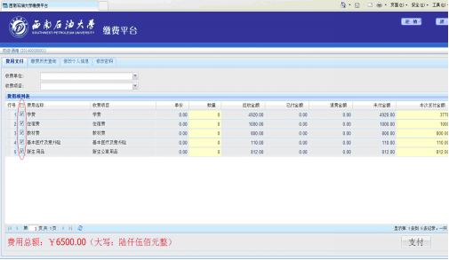 當有多條繳費記錄時,在“費用項列表”中勾選所需支付的費用項,默認全額支付,如不能一次付清,可在“本次支付”下(顏色表示為淺黃色)直接輸入要繳納的金額。在左下方會產生相應的“費用總額”如圖3所示 ,“費用總額:6500”中“6500”為本次繳費所繳納的總金額。