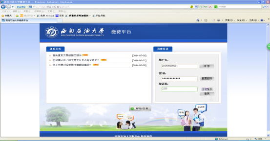 為方便各位在校學生繳納學雜費,財務處已開通網上自助繳費系統“西南石油大學繳費平臺”。校財務在原有繳費方式的基礎上全面推出網上自助繳費系統,在網上自助繳費系統中為學生們提供了學雜費繳納、個人信息修改等功能。網上自助繳費的開通讓同學們繳納學雜費輕松快捷,無需再耗費時間排隊等候;網上自助繳費全天24小時可操作,隨時隨地都可輕松完成。